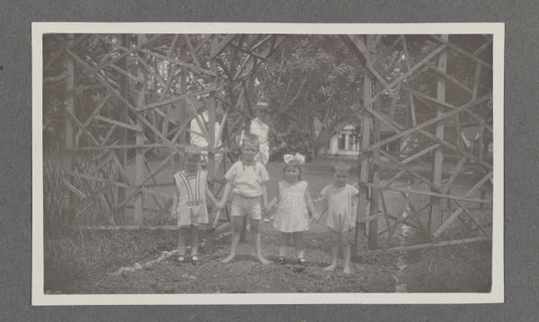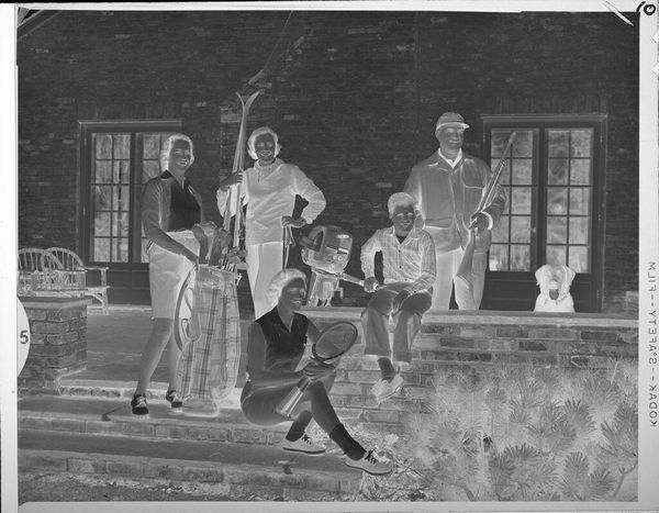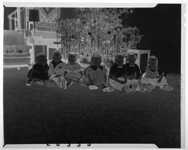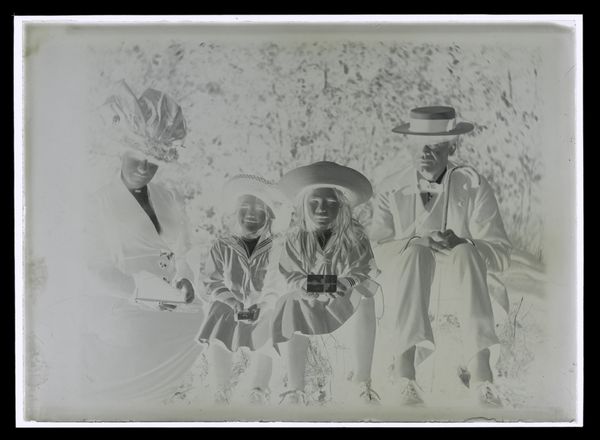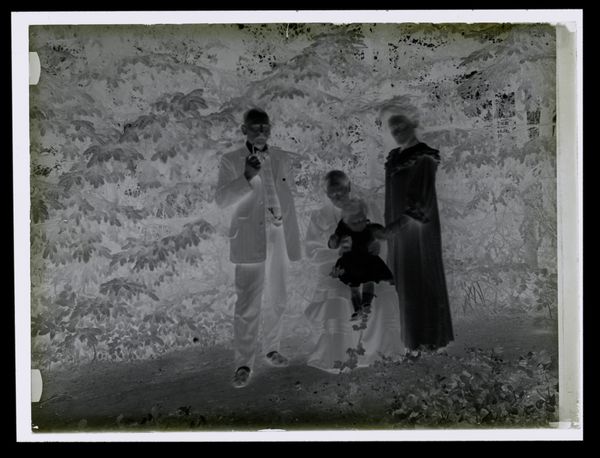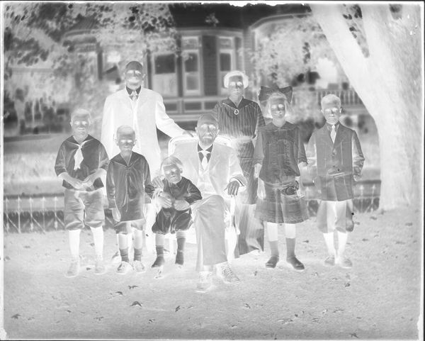 Editor: This is an untitled photograph by Hamblin Studio, showing a family portrait. It’s interesting as a negative, almost ghost-like. What can you tell me about it? Curator: Note the attire and setting. The labor involved in producing clothing like this, the leisure time to pose for a photograph, even the materials of the photographic process itself, all speak to specific economic realities. How do these details influence your understanding? Editor: I see how the clothes indicate a certain class, but does the photograph's creation change its artistic value? Curator: The value lies in the accessibility and democratizing effect of photography as a medium, challenging traditional art hierarchies. I appreciate how it captured a moment in time. Editor: That's a great point; thinking about photography as a means of production changes how I see it.
