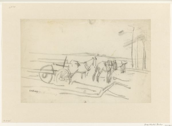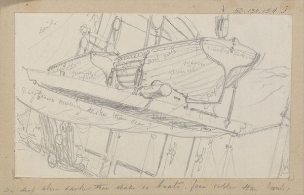 Editor: This is "Studie van een beurtschip", or "Study of a Freight Barge," created sometime between 1856 and 1894 by Jan Vrolijk. It’s a pencil drawing currently held at the Rijksmuseum. I'm really struck by the delicacy of the lines. What stands out to you? Curator: What captures my attention is the composition itself. Notice the sparseness of the strokes, the way the artist uses line to delineate form, creating depth with such economy. The light pencil work seems almost ephemeral, wouldn’t you agree? Editor: I do! The sketchiness makes it feel very immediate. Is that common for realism, to feel so… unfinished? Curator: Realism doesn’t necessitate a fully polished aesthetic. What’s crucial here is how Vrolijk has prioritized the precise rendering of visual information. It is a study, as the title suggests. Ask yourself: how do the formal elements contribute to a reading of “realism”? What does the light pencil work convey about the scene or subject? Editor: It feels like he's capturing a fleeting moment. Almost like a photograph, but with more… soul. I hadn't considered how deliberate the sketchiness could be. Curator: Precisely. Think of this drawing as an investigation of form through minimal means. Notice the positioning of the boats and the way he handles perspective; it presents a reality, captured using specific visual techniques to evoke a certain mood. How would you describe the rhythm? Editor: I'd say it's gentle, almost dreamlike, due to the soft lines and muted tones. Curator: And that contributes directly to the artwork's success as a formal study. What seems simple at first glance contains multitudes. I'm leaving this audio guide with an improved appreciation for realism. Editor: Agreed! Looking closer at how line and form work together has completely changed how I see this piece.