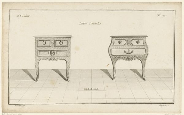 This line drawing, titled "Twee commodes," presents two chest of drawers, created by an anonymous artist. This work gives us a glimpse into the world of 18th-century European furniture design and the cultural values embedded within. During this period, furniture was not merely functional; it was a statement of identity, reflecting the owner's social standing, taste, and engagement with cultural trends. Notice how the commodes, one 'in the Bohemian style' and the other 'in the Polish style' incorporate decorative elements that evoke specific cultural identities. While these styles added to the owner's sense of self, they also served to perpetuate stereotypes. Although practical, the chests were designed with display in mind. They would have held intimate, personal objects, but they would also have been conversation pieces, admired for their aesthetic qualities and the stories they told about their owners. In this way, "Twee commodes" illustrates how design objects actively participate in shaping and performing identity within the broader theatre of society.