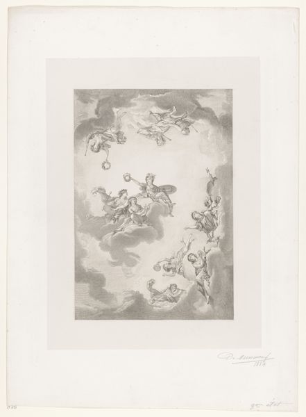 Jules Chéret created "La Danse" as a lithograph, where a figure in motion is rendered in shades of sanguine. The composition swirls with movement, as if capturing a fleeting moment of energy and exuberance, evoking a sense of joy and liberation. Chéret, often associated with the poster art of the Belle Époque, demonstrates how line and form intersect to create a dynamic visual experience. Here, the composition is not just an arrangement of figures but an exploration of space and motion. The use of lithography, with its capacity for capturing subtle tonal gradations, allows Chéret to convey a sense of depth and texture. The choice of a warm sanguine hue further enhances the artwork's sensuality, inviting the viewer into a world of playful spectacle. The overall effect is one of lightness and buoyancy, reflecting the artist's fascination with capturing the ephemeral beauty of modern life. This is more than just a depiction of dance; it is a formal investigation into how art can capture movement, feeling and the fleeting nature of existence.