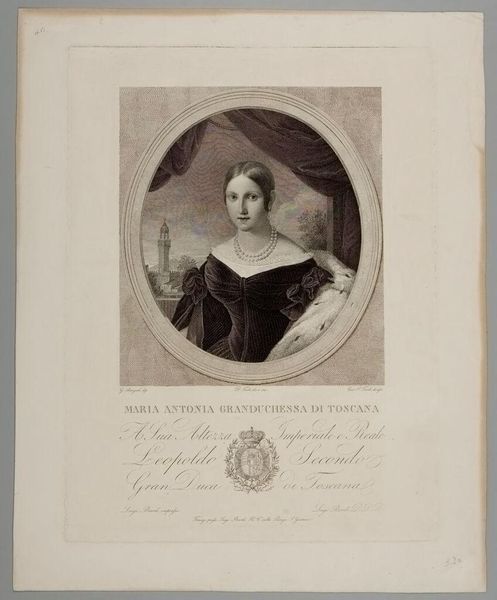 Editor: This is "La Belle Ferronnière" by François Eugène Augustin Bridoux, currently residing at the Harvard Art Museums. The subject’s gaze is so striking, almost confrontational. What do you see in the formal elements of this portrait? Curator: The composition is notably simple, structured by the figure's placement within the dark, undefined space. Note how the light emphasizes the texture of her clothing and the geometry of her jewelry. Editor: It's interesting how the artist uses light to create depth with minimal background details. Curator: Precisely. The contrast between light and shadow is carefully calibrated, contributing to the work’s enigmatic mood. It is a potent study in form. Editor: I see it now. It’s all about the interplay of light, shadow, and texture. Thanks for pointing that out! Curator: My pleasure. Formal analysis offers a unique and focused entry point into understanding artwork.