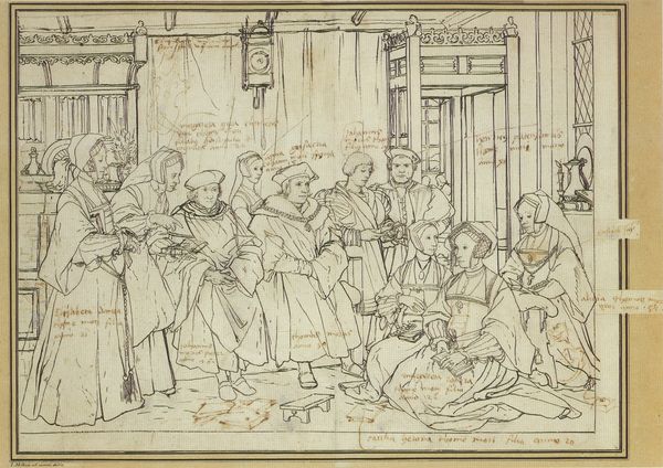 Editor: Here we have a photographic reproduction of a pen drawing from around 1875-1900, a study by Hans Holbein the Younger for his painting of the family of Thomas More. The mood seems quite formal, very staged, as was common for family portraiture then. As a historian, what stands out to you in this representation? Curator: What jumps out is not merely the depiction of a family, but the projection of power and piety, carefully constructed for public consumption. Consider the context: Thomas More was a towering figure—a statesman, a lawyer, a philosopher, a writer, ultimately martyred for his faith. How does this image reinforce or perhaps challenge the public persona of More and his family, especially considering it's a *study*, not the finished work? Editor: That's fascinating. So, it’s not just about showing who they are, but also about solidifying their image and legacy? Are the details in the room symbolic? Curator: Precisely. Think about the choices Holbein makes, and, perhaps, the instructions More himself gave. Where does he place himself within the group? What objects surround them? These details tell a story about their values, their status, and how they wish to be perceived by future generations. A portrait of this kind becomes a powerful form of political and social propaganda. Editor: So, the political climate deeply informed the choices in this portrait, even down to the objects in the background. I hadn't thought about it that way. Curator: Exactly. The Renaissance was a period of immense change, of religious upheaval, and of shifting power dynamics. Understanding the cultural and political landscape is crucial for understanding the purpose and impact of images like these. It truly brings a new perspective to just seeing the family! Editor: It's amazing how much a seemingly straightforward portrait reveals when viewed through a historical lens. Curator: Indeed. By examining the public role of art and the politics embedded within, we uncover layers of meaning that might otherwise remain hidden.