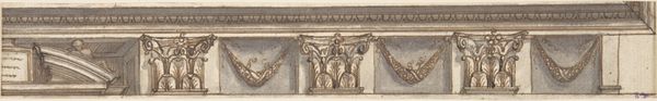Curator: Here we have "Section of a Parapet," a drawing rendered in ink on paper by Karl Ballenberger, currently held at the Städel Museum. The piece gives us an intriguing glimpse into architectural details, likely from the 19th century but evoking the Medieval or Gothic styles. What's your initial impression? Editor: Stark simplicity, right? Like an architect's daydream, scribbled on whatever scrap was handy. But even in this stripped-down form, you feel that soaring, striving… that's pure Gothic ambition distilled into lines. Curator: Indeed. The linear style emphasizes the geometric forms, and invites exploration of the symbolism inherent in Gothic architecture. The arches, the repeating patterns... They resonate with historical narratives, religious beliefs, and a certain aspiration towards the divine. What do these forms suggest to you? Editor: Those pointed arches, they're everywhere in Gothic design, aren't they? Reaching for the heavens! It’s kind of funny to see that grand, dramatic gesture rendered so…neutrally here. Like a blueprint for yearning. I almost want to doodle some gargoyles on it. Curator: That yearning, as you describe it, has powerful cultural roots. Gothic architecture, particularly its emphasis on verticality and light, was designed to evoke spiritual awe, symbolizing transcendence. A parapet, in this context, served as a protective barrier and, at the same time, offered a view to something greater. Ballenberger isolates that sense of transition between worlds, so to speak. Editor: I get that. It’s the in-between place, the border. So it makes me think about hidden things too – the ideas that built it up, beliefs literally set in stone. Not so neutral, huh? There’s more to it than meets the eye…or the first casual glance. Curator: Exactly. It invites contemplation of architectural legacies and the psychological impact of historical spaces, which are more easily captured on something temporary like ink on paper than the imposing stone from which they draw their power. Editor: Well, I am going to carry that soaring feeling away with me. Never underestimate what one can build from simple plans... or dream about while sketching one.