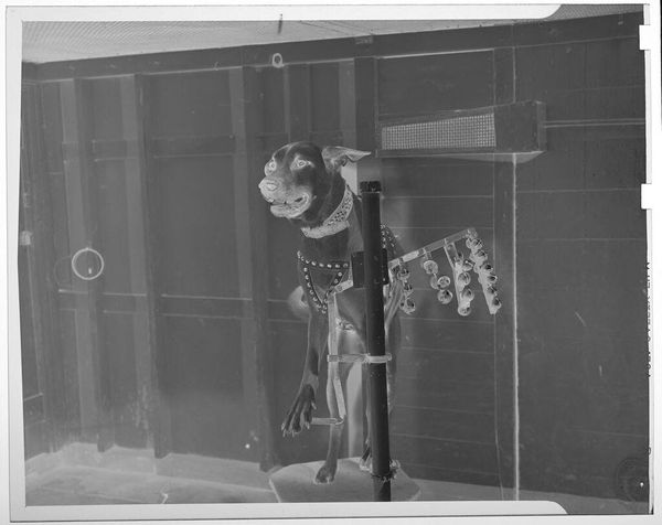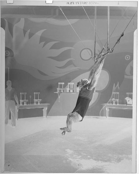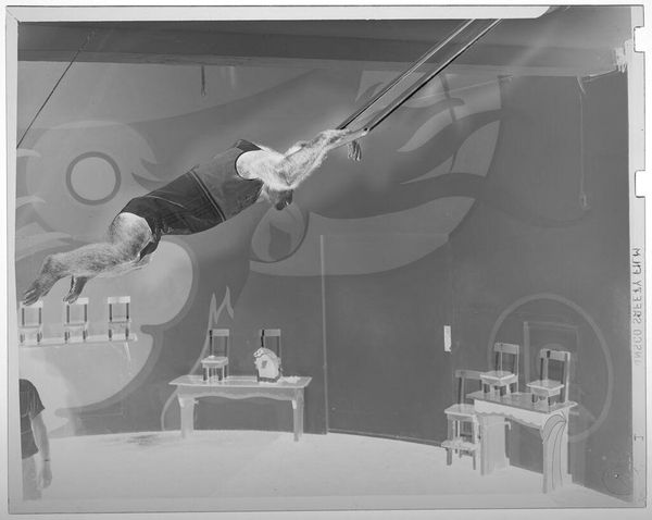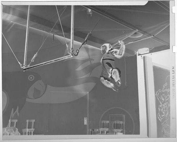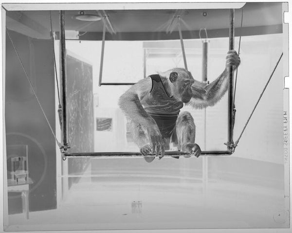 Editor: This photograph by Jack Gould, titled "Untitled (chimp swinging from gymnastics bar)," depicts a chimpanzee performing on a gymnastics bar. It's such a striking image, but I am left wondering, what can we say about the setting and the chimp's role? Curator: This image prompts reflection on the socio-political history of animal entertainment. How does the juxtaposition of a wild animal in a manufactured, human-designed setting – a circus, perhaps – speak to our complex relationship with nature and our tendency towards exploitation? Editor: That's a really interesting take. It makes me think about the ethics of animal captivity for entertainment purposes. Curator: Exactly. The photograph functions as a historical document, silently asking critical questions about the ethics of spectacle and the public's appetite for exotic displays. It's a stark reminder of past practices. Editor: I never thought of it that way. It's powerful how a seemingly simple image can reveal so much about cultural values and historical context.