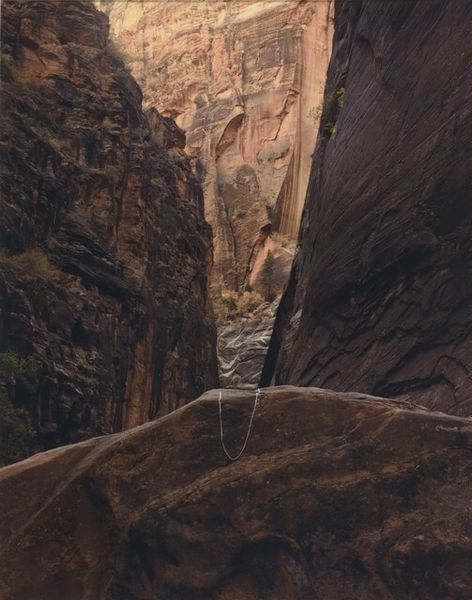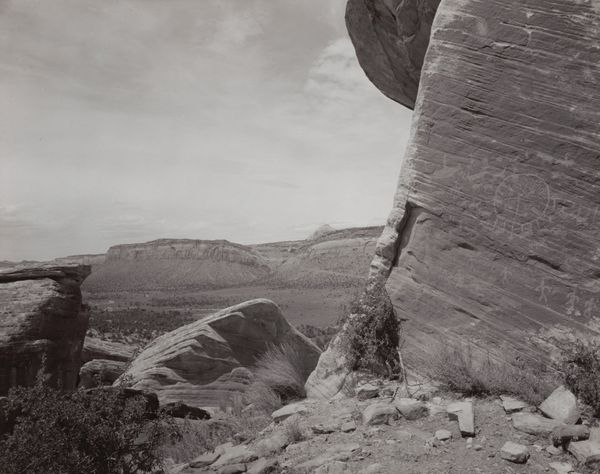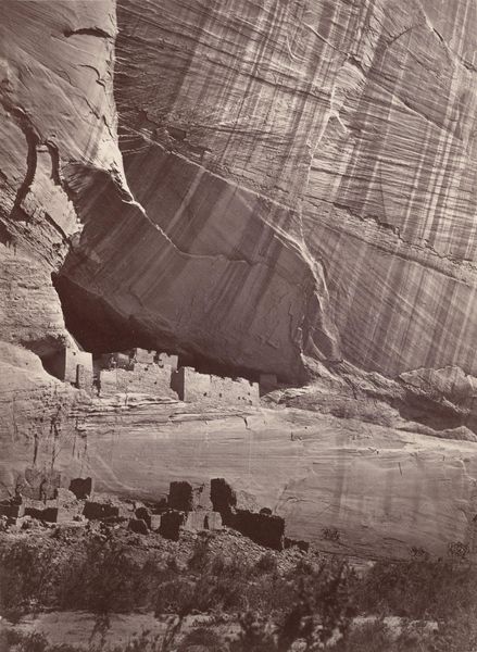 Editor: Ansel Adams’s black and white photograph, "White House Ruin, Canyon de Chelly National Monument, Arizona," possibly taken between 1942 and 1981, has such stark contrasts and really emphasizes the immense scale of the canyon. What stands out to you about this image? Curator: I think it's significant how Adams photographs this ancestral Puebloan site. This photograph, made for public consumption and distribution, participates in constructing and circulating a specific narrative. What aspects of this image contribute to that narrative, do you think? Editor: Well, the ruin is presented as this isolated structure against an almost overwhelming natural landscape. It feels timeless, but also fragile. Is that what you mean? Curator: Exactly. Consider how Adams omits evidence of modern Navajo presence, who are the current inhabitants and stewards of the Canyon de Chelly. His composition romanticizes the past, focusing on the ‘ruin’ while ignoring the living history of the site and the political realities of Indigenous land rights. He frames the White House ruin, therefore, in the tradition of 19th-century sublime landscape painting and photography. It creates a kind of…noble ruin. Editor: So it's less about the ruin itself, and more about how Adams chose to portray it, creating a certain historical narrative for the viewer. Curator: Precisely. Photography is never neutral; it's always a product of specific choices and intentions within a particular cultural context. Editor: I hadn't considered how selective the image is, I guess I got caught up in its beauty. Thanks! Curator: The visual power is undeniable, and acknowledging that alongside the constructed narrative only enriches our understanding.