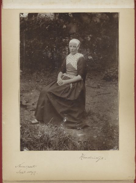 Editor: This is a photograph, "Portret van Lily Holle," dating from before 1894, by Hendrik Herman van den Berg. The woman has such a serene presence, almost as if she's paused mid-stroll just for the portrait. How should we read this work, keeping its historical moment in mind? Curator: That "pause," I think, is key. Pictorialism, which this image embodies, sought to elevate photography to the level of fine art, often imitating painting. Consider the context: photography was relatively new. By softening the focus and carefully composing the shot, van den Berg challenges the idea of photography as purely objective. He's constructing a specific, idealized vision. Do you see echoes of genre painting here? Editor: Absolutely! It reminds me of Impressionist landscapes with figures, but more…posed. The soft focus creates an almost dreamlike effect. It seems staged to me. What message was Van den Berg trying to convey with such imagery? Curator: In that era, the role of women in society was being actively debated and redefined. Photographs like this could be seen as promoting a particular ideal of womanhood—refined, educated, enjoying leisure time. What does the lace collar and hat suggest to you? How might that outfit signal a specific social standing? The flowers, the perfectly managed walk--everything is curated. Editor: That makes me reconsider my initial impression. It’s not just a serene moment, but a constructed performance of femininity and class. Thank you, I wouldn’t have caught the subtleties if we didn't contextualize it. Curator: Precisely. And recognizing that "performance" helps us understand how images participated in broader social and political dialogues. Now, how do you think this photograph interacts with contemporary ideas around identity and representation?