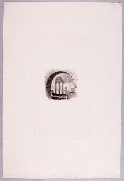 Editor: This is a print of "The Forum" by Edward Goodall, and the medium looks like etching or engraving. The image is small and intimate, framed by an archway. What do you make of it? Curator: Let's consider the production of this image. Etchings were relatively accessible. This print allows for the mass dissemination of Roman architectural imagery, turning cultural heritage into a commodity. How does this affect our understanding of the Forum itself? Editor: So, the act of reproduction changes the meaning? It's no longer just about the Forum, but about the *consumption* of its image? Curator: Exactly. It speaks to a broader socio-economic context – the art market, tourism, and the packaging of history. It makes me think about labor, too. How many prints did this plate produce? Editor: That is interesting, thinking about the print as a product of its time, rather than just a depiction of a place. Curator: Indeed. Materiality and distribution networks reshape our engagement with art.