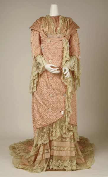 Editor: This is an evening dress from 1896-1897 by Rouff, held at the Metropolitan Museum of Art. It's made of silk and it has all these frills and ruffles. What I find particularly interesting is how much labor must have gone into creating this one dress. What catches your eye? Curator: Precisely. Looking at the silk, we have to consider its origins, likely China, and the trade networks that facilitated its arrival in Europe. Think about the labor involved in silk production: the silkworms, the cultivation of mulberry trees, the spinning and weaving – all intensely human activities. Then, Rouff, a Parisian couture house, transforms it, adding layers of skilled labor - cutting, sewing, embroidery, all the meticulous handwork needed to construct such a garment. It embodies globalized production chains before globalization was even named as such. Editor: So it's not just about the final design, but also where it comes from and how it’s made. Did the materials influence the design or the other way around? Curator: That's the crucial point. It’s a cyclical relationship. The availability and properties of silk, its drape and sheen, would have certainly informed Rouff's design choices. Simultaneously, the demands of fashionable silhouettes dictated specific qualities and quantities of materials. The Industrial Revolution definitely helped with mass producing textiles but haute couture pieces such as this evening dress speak volumes of craftwork performed. Do you think this complicates or enriches the interpretation? Editor: I think it makes it more real. Instead of just seeing a pretty dress, you think about all the people involved. Thank you! Curator: Indeed, understanding the means of production pulls back the curtain on the often-hidden realities of art and consumption. Thinking about material informs a far more complete cultural understanding.