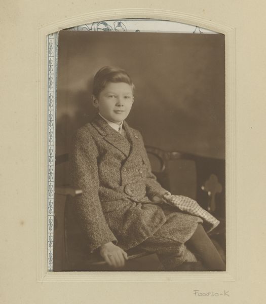 Curator: This photograph, possibly titled "Portret van een jongen," and credited to Jan Gottfried Stütner, dates sometime between 1913 and 1926. It's a gelatin-silver print. Editor: My first impression is one of slightly unsettling formality. The boy’s stiff posture, the dark background… it almost feels like a still from an old film. There's an interesting tension in such manufactured innocence. Curator: The materiality speaks volumes. Gelatin silver prints were a standard photographic process at the time, widely accessible, allowing for relatively sharp images, although the paper processing and chemistry for this time might speak volumes about consumerism in that particular cultural context. But beyond the technique, note the inscription "WHODUTTIO" on top of the picture—is it part of the making, some annotation about the subject? Editor: That’s a fantastic detail. It immediately turns my mind to questions of identity and the cultural codes this boy inhabits. The almost bureaucratic text juxtaposed with the portrait evokes a sense of… cataloging, doesn't it? We could speculate whether the picture was taken by his parents, in which case these labels have some reference with the photographer that gave place for production. Curator: Precisely! The printing itself would have been a process subject to specific, industrial constraints and cultural choices. The suit suggests some sort of middle-class aspiration as well, the jacket's weaving texture giving a certain appeal beyond the rigid constraints of the photograph. Editor: And the boy’s gaze is direct, almost challenging. He's aware of being observed, and I wonder what inner world that seemingly expressionless face conceals. Children were commonly presented under specific archetypes, like the cherub, the "working-class child", the intellectual... and I see that social and psychological tension right here. Curator: I completely agree. Analyzing the wear and tear of the photograph, the aging of the gelatin, even the possible imperfections in the developing, can illuminate aspects of its life cycle. For instance, how many times has it been handled? Who kept it? Editor: Exactly! Thinking about the survival of symbols like dress and photography is crucial. Overall it feels like such a revealing portrait that carries the symbols of its era. Curator: Indeed, it has prompted some interesting thinking about photography, the process behind the making and printing. Editor: A truly interesting and engaging picture—revealing that cultural background and all the psychological layers behind it.