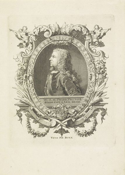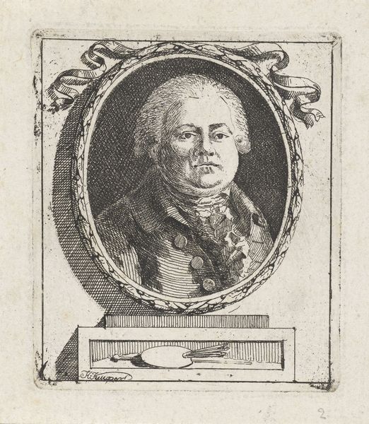 Editor: Here we have a print entitled "Hans de Hofman," made sometime between 1752 and 1833 by Meno Haas. It’s a Baroque-style portrait. It looks quite formal, and the circular frame-within-a-frame is very striking. What do you see in this piece? Curator: I am immediately drawn to the arrangement of symbolic objects around the portrait, and their role in communicating status. The seal and inscription denote official titles, the papers imply scholarship, and the inkwell alludes to writing and diplomacy. This assemblage, arranged symmetrically beneath the portrait, works as a visual representation of the sitter's accomplishments, freezing them in time. Notice the hat to the side of papers. How does this alter the feeling of the piece? Editor: It suggests action, doesn't it? Like he’s a man of the world who is ready to set off on new endeavors! Is that what it was supposed to communicate at the time, or has the meaning shifted over the years? Curator: The core message likely remained the same - someone capable and busy. The details, though, acquire additional weight over time. The powdered wig, for instance, no longer signifies refinement but situates the image within a specific era, evoking a world of elaborate courtly rituals. We can now reflect on both the immediate and lasting cultural impact. What has impressed you the most? Editor: Definitely the lasting impact – how objects and symbols speak to us, even when their immediate context is gone. There’s a sense of preserved identity that is really powerful! Curator: Absolutely, the portrait continues to speak across the ages, inviting conversation with the past.