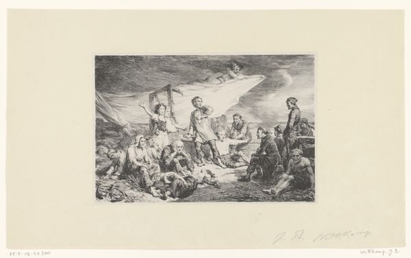 Curator: Let's discuss "A Thirst for Art" by John Sloan, held here at the Harvard Art Museums. It's a fascinating glimpse into the art world of his time. Editor: It feels cramped and chaotic, doesn't it? So many bodies crammed together, all vying for a look. What medium are we looking at here? Curator: This is an etching, a printmaking technique allowing for detailed linework. Sloan often depicted everyday life, and this scene appears to show an art exhibition. Editor: I am immediately drawn to how Sloan represents the commodification of culture here. The figures are tightly packed, suggesting both a desire for artistic enrichment and a sense of social obligation. What about you? Curator: I see a critical commentary on the social rituals surrounding art, the performative aspect of attending such events. It invites us to question the motivations behind our engagement with art. Editor: The labor and consumption of art are inextricably linked, and Sloan captures that dynamic so well here. Curator: Indeed. It’s a potent reminder of the social and economic forces that shape our experiences. Editor: It makes me think about who has access to art, and what their role is. Curator: Absolutely, Sloan’s etching prompts a valuable discussion about art, access, and the dynamics of social spaces. Editor: A thought-provoking etching, reminding us that art is not made in a vacuum.