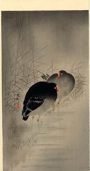 Curator: What a serene piece! My first impression is how peaceful these birds appear against the muted background. Editor: Indeed. This is "Three Tame Pigeons," a woodblock print crafted between 1900 and 1930 by Ohara Koson, an artist associated with the shin-hanga movement which revitalized traditional ukiyo-e printmaking. Curator: Ah, shin-hanga. So we see that blending of East and West, appealing to European tastes while keeping traditional Japanese methods alive? What’s striking is the use of subtle gradations; they capture the texture of the birds' feathers beautifully, almost like a watercolor. You can almost feel the artist engaging with the physical act of carving the woodblock itself. Editor: Absolutely. The socio-political aspect of this work lies in its commercial appeal. The shin-hanga movement was largely driven by the desire to create art that could be exported, consumed by a Western audience interested in idealized depictions of Japan. These prints became commodities in the global art market. Curator: The pigeons themselves become interesting from this angle, symbols of domesticity, adapted and fashioned for market demands. There is a distinct sense of "Japan-ness" fabricated for consumption here. Do we know if he used photographs or sketches when developing his works? How was he positioning traditional Japanese arts into these global consumer habits? Editor: Historical documents suggest Koson and the other artists may have used photographs to supplement preliminary sketches. I imagine it assisted greatly in their efficient production for commercial demands. Think about it, printmaking would take several weeks for a small run and would have required extensive collaboration to reach the Western audience. Curator: What I appreciate is that despite the market considerations, the artisanship involved remains remarkable. The choice of materials, the skilled labor to carve the wood, and the dedication that this artisan must've required speaks to an inherent value. It reminds me that behind every product is a tangible process. Editor: Precisely. This print allows us to examine not only the artwork but also its context: the artistic movements, economic conditions, and consumer preferences that influenced its creation and its reception. These elements provide a full understanding of the print’s continuing appeal. Curator: Seeing it through the lens of the shin-hanga movement helps understand how art transforms within complex global interchanges. Thank you! Editor: My pleasure. It’s important to consider how historical forces continuously mold the trajectory of art.
