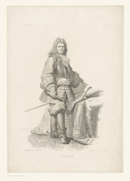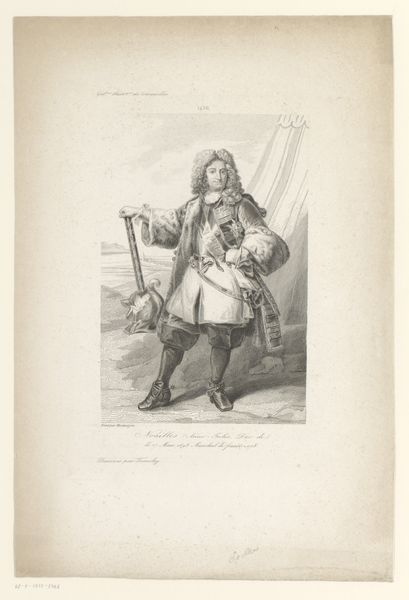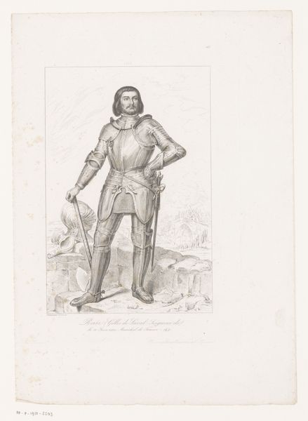 Curator: Nicolas Edouard Lerouge created this portrait of Jean Poton de Xaintrailles between 1838 and 1841, rendered in graphite and pencil. What are your initial thoughts? Editor: There's an arresting stillness here. It's predominantly graphite and it captures the texture of both the sitter's skin and polished armor so vividly. He appears almost contemplative, despite being in his full military regalia. Curator: Absolutely. This portrait, made almost 400 years after de Xaintrailles's death, fits squarely into a specific historical narrative: that of the chivalrous French hero. Lerouge deliberately evokes the idealized past, where identity, honor and military prowess were intertwined for men of the French court. Editor: I'm struck by how Lerouge emphasizes the materiality of warfare. The meticulously detailed armor speaks of skilled craftsmanship, but it is also there to evoke warfare as industry – protection and status as commodities produced to fuel endless political contest. Curator: A crucial element! The pose too. The subtle relaxation of the figure and the somewhat ambiguous and distant horizon contrast beautifully, making the military garments feel both necessary and superficial at once. The image also presents an example of masculine codes: one arm absent in its armor, and another leaning softly in comfort upon the prop beneath it. Editor: I agree. And this juxtaposition of repose against armor can make us reflect on what de Xaintrailles could be fighting against; maybe his interior battles that have no materiality other than their consequences. We have the hardness of metal and stone, and a softened flesh that bears the wounds of external conflict and history. Curator: By examining those intersecting threads – personal vulnerability and heroic stature– we confront history’s inherent complexities, which also provides an open doorway for discussions around power dynamics, gender roles, and our continued relationship with representations of leadership in both past and present eras. Editor: Right, thinking about it more, the drawing really captures both a human story and a grander statement about labor, industry, and war. Food for thought!