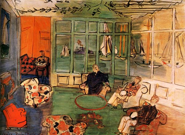 Curator: Raoul Dufy painted "Indian Model in the Studio at l'impasse Guelman" in 1928. What strikes you about this work? Editor: It's an explosion of light! A casual, almost unfinished energy permeates the scene, even in the figure. You can practically smell the oil paint. It gives the whole composition such a sense of immediacy. Curator: The layering of patterns and vibrant colors creates a unique visual language, doesn't it? I think Dufy's use of these bright colors is so interesting here; they aren't realistic at all. Editor: Absolutely, the materials become part of the subject. Notice how he applies the oil so thinly, creating a watercolor-like transparency, it's integral to the mood. Was this typical for Dufy? Curator: Yes, actually! This evokes fauvism but Dufy brings an added layer of modernity. The repeated motifs – the rugs, the canvases – also create a sense of depth and a visual rhyme within the studio. Notice the glimpse of Parisian rooftops in one painting on the wall! That use of oriental rugs carries weight considering colonialism, and how European markets handled textiles like this one in France at the time of this artwork's creation. Editor: It’s definitely worth considering the model's sari in that context. The materials are laden with economic implications. How was Dufy positioned socially in this exchange? He was of modest background but successful with dealing and exhibiting. Curator: His studio here is a sanctuary and a display, a carefully curated space reflecting his artistic persona. These symbols have their own stories of trade, consumption and artistic interpretation in France at the time, no doubt. It provides layers of complexity in this studio interior and how women of color are displayed within this context. Editor: Thinking about the context, it’s hard to unsee that labor is removed or romanticized, even made aesthetic within a certain class privilege. Curator: Agreed, this really has opened up different interpretations of Dufy for me, through those elements of the artistic process and its many cultural contexts. Editor: Indeed, a consideration of Dufy's techniques alongside the cultural milieu sheds new light on the work.
