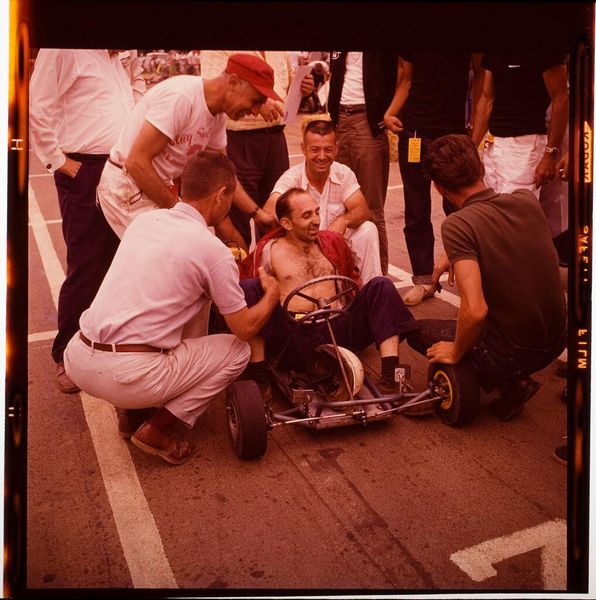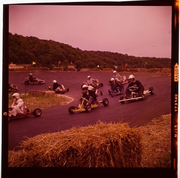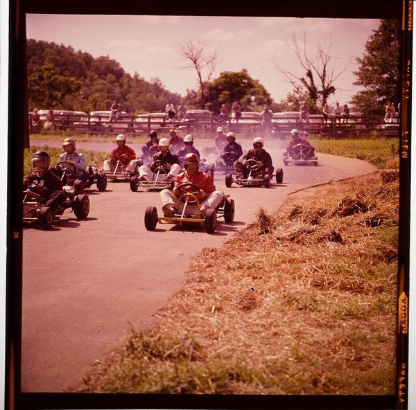 Editor: This snapshot by Jack Gould, "Untitled (man sitting in tiny racing car)," presents a peculiar scene. What's striking is the juxtaposition of the man's seriousness and the comical nature of the go-kart. What symbols do you see present here? Curator: The small racing car is an interesting symbol. It represents speed and progress, yes, but also vulnerability and a loss of control. See how the man sits exposed, vulnerable in his flimsy vehicle. It’s a potent image of ambition tempered by reality. Editor: So the go-kart challenges our expectations of the typical race car, becoming something more complex. Curator: Precisely! The image becomes a poignant reflection on our human condition. How do we navigate our aspirations within the limitations of our own existence?