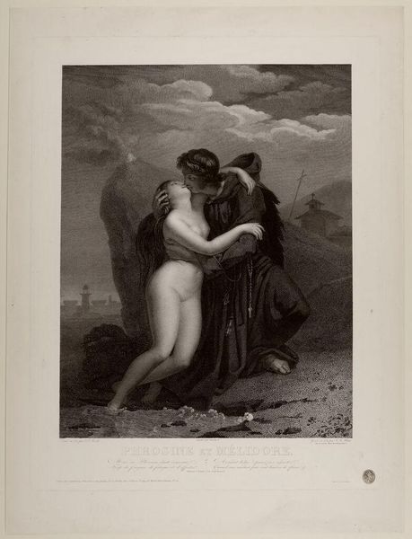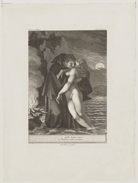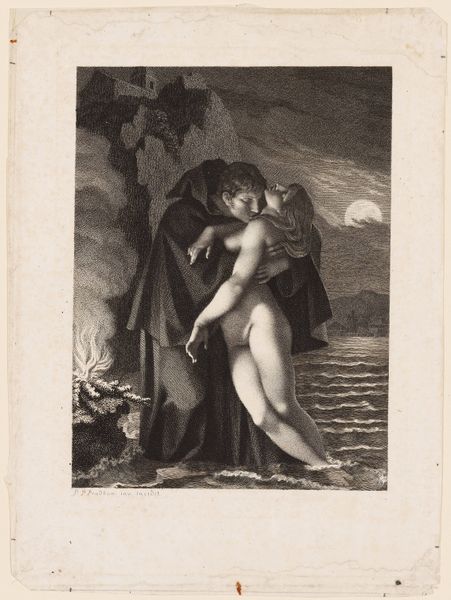Pierre-Paul Prud'hon created "Phrosine et Mélidore," a print which captures a dramatic moment between its titular characters. Prud'hon was working during a tumultuous period in French history, and he navigated the changing political and artistic landscapes of the late 18th and early 19th centuries. In this image, we see a figure, presumably Mélidore, cloaked and embracing a nude woman, Phrosine. The setting, with its craggy rocks, fire, and moonlit sea, heightens the emotional intensity of the scene. Phrosine seems to be awakening in the arms of Mélidore, which develops an alternative narrative to the traditional representation of women. Prud'hon was known for his sensuous and emotionally charged works, and he was influenced by both the Neoclassical and Romantic movements. While his art often depicted mythological and historical subjects, his nuanced portrayals of emotion and the delicate treatment of light and shadow set him apart. Consider how Prud'hon uses the interplay of light and dark to convey the emotional depth of this encounter, inviting us to contemplate themes of love, rescue, and transformation.
