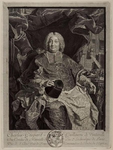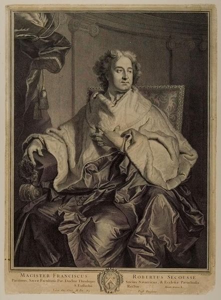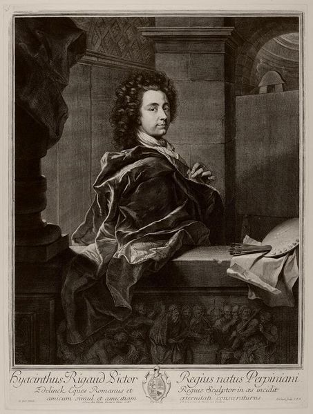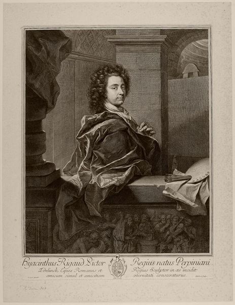 This is Gérard Edelinck’s portrait of Hyacinthe Rigaud. It was created with engraving. The image transports us to a time when portraiture was the domain of the elite, reflecting the sitter’s status and the prevailing social hierarchies. Edelinck, who himself was ennobled, captures Rigaud, a fellow artist, amidst symbols of his profession. Notice the tools of Rigaud’s trade and the sculpture, signaling the intellectual environment in which Rigaud operated. Rigaud's success was deeply entwined with his ability to portray the aristocracy and royalty. In those portraits, how did Rigaud navigate the expectations of his patrons while also expressing his artistic vision? This image is not merely a likeness but a statement about the power and prestige associated with artistic production. It prompts us to consider the complex interplay between art, patronage, and social identity in the 17th century. What stories do we tell about ourselves through art?