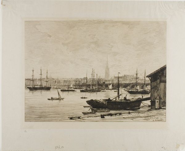 Kasparus Karsen produced this pen and brush drawing called "Havengezicht" which translates to "Harbor View" in the nineteenth century. It reflects the prevailing artistic conventions and social concerns of the Netherlands at that time. The image presents a serene harbor scene, typical of the Dutch Romanticism, but it also echoes a concern with national identity and historical pride. The detailed architectural rendering of the harbor fortifications speaks to the Netherlands' historical prowess in maritime trade and naval power, crucial to its economic and political status. This artistic focus can be seen as a response to the changing socio-political landscape of Europe during the 19th century, as the Dutch sought to reaffirm their cultural identity through art. To fully appreciate this work, we might consult historical archives, city plans, and maritime records. This helps reveal how Karsen's artistic choices reflect the complex interplay between historical memory, national identity, and artistic expression in the 19th-century Netherlands.