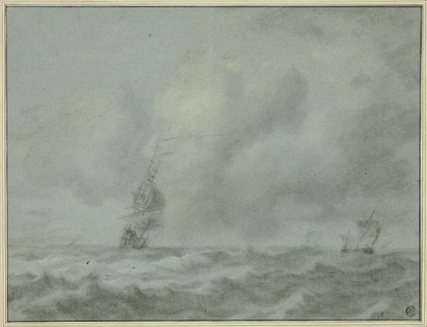 Curator: Robert Charles Dudley created this watercolor and ink drawing entitled, "The Great Eastern Under Weigh, July 23rd, 1865: Escort and other Ships, H.M.S. Terrible, H.M.S. Sphinx, The Hawk and Revised: The Caroline" sometime between 1865 and 1866. Editor: It's got a wistful feeling to it, don't you think? The soft palette against the choppy seas...a fleeting moment caught with delicacy. I almost feel like I'm on one of those ships, experiencing that grand departure. Curator: It's quite striking, particularly when you consider the subject—the Great Eastern, a marvel of Victorian engineering designed to lay transatlantic telegraph cables. We are looking at it under way with escort ships after it was refitted. Dudley, trained as a marine engineer himself, was fascinated by maritime technology and regularly documented the ship's voyages. Editor: Engineering or not, the water steals the show for me! See how it's rendered, those swirling yellows and blues? It's so alive, almost as if the ocean itself is a character in the scene. The way it almost obscures those tiny figures of people is interesting. Curator: Yes, the texture is intriguing! What's captivating is the tension Dudley creates between the industrial prowess of the Great Eastern and the uncontrollable power of nature. Consider the Victorian era's obsession with progress and domination—and how this work visually encapsulates their complex relationship to their environment. Editor: Maybe! I keep seeing this melancholy—all the smokestacks fading into a grey sky. Like the end of something, instead of the beginning. Perhaps the people on deck, barely visible in the painting, already understood the weight of all that supposed "progress"? Curator: Well, these vessels needed manpower—consider the sheer number of labourers required to operate a ship like the Great Eastern, from stokers feeding the furnaces to sailors manning the rigging. That watercolor you see belies an enormous human infrastructure that quite literally fuelled its movement across the seas. Editor: It still feels sad to me—and honestly, even a little spooky. I think the lack of detail helps with that. Whatever one calls "progress" seems so small when swallowed by the sea! I love a scene that hints at bigger stories beneath the surface. Curator: Agreed. And thinking about the artwork's materiality itself is revealing too, the way he utilizes watercolor and ink wash—the fluidity mirrors the movement of the ocean, the technical lines echo the precision of shipbuilding. A marriage of art and industry... a testament to its time!