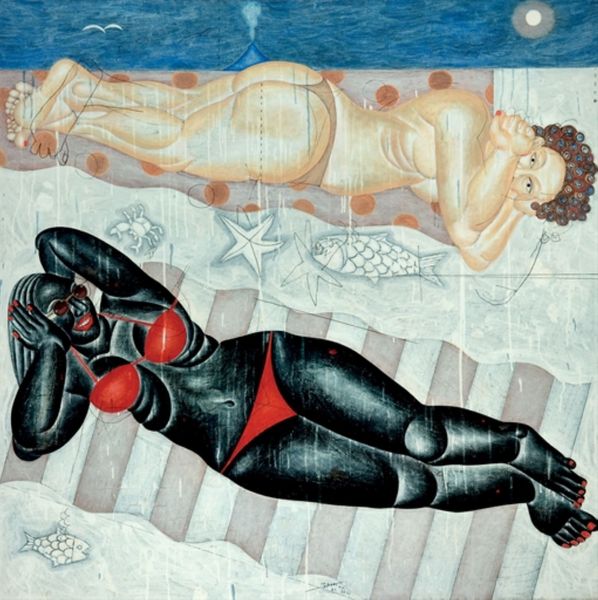 Oleg Holosiy made this Mermaid painting, we're not sure exactly when, but it feels like an outpouring of something urgent. The surface texture is amazing; Holosiy works thin layers of oil paint, scumbling to suggest movement of the water and luminosity of skin. Look at the way he has defined the body of the mermaid - not with sharp lines but through tonal variations and loose brushwork. It's all about how he models the form with light and shadow. The painting feels both dreamlike and immediate. See the pool in the lower right corner of the painting, the way that little square is filled with gold squiggles, like a cartoon of the water reflecting light? It reminds me of Sigmar Polke's paintings, where he brings a sort of wry humor to his process. Holosiy died so young, in his twenties. It's fascinating to consider how painting, with its inherent ambiguities, can keep evolving and taking on new meanings.