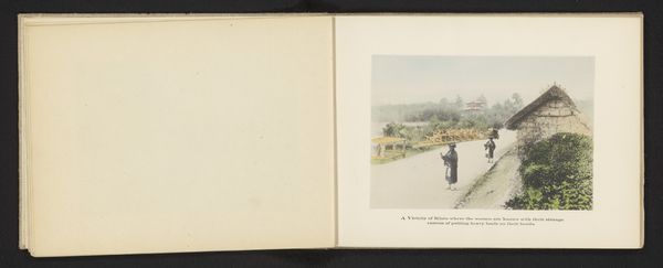Editor: This lovely hand-colored photograph, titled "Kersenbloesems in het Uenopark in Tokyo," by Kōzaburō Tamamura, dates back to around 1895-1905. It feels incredibly serene. The delicate blossoms create this hazy, almost dreamlike atmosphere. What strikes you most about its visual structure? Curator: Indeed, the tranquility is immediately apparent. Observe how the composition is orchestrated: The receding lines of trees and the path establish depth, drawing the viewer into the scene. The branches, particularly of the weeping cherry, act as visual calligraphy, their sinuous forms creating a dynamic counterpoint to the stillness of the overall landscape. Editor: The use of color is also interesting, especially since it's hand-colored. It’s not hyper-realistic. It adds to that dreamlike quality. Curator: Precisely. The subtle application of pigment draws attention to the materiality of the photographic print itself. Consider, also, how the placement of the figure in the rickshaw anchors the composition without disrupting the visual harmony. It's a carefully calibrated balance between stasis and kinesis, wouldn't you agree? Editor: Absolutely. I see how each element contributes to this delicate balance you describe. Before this conversation I wouldn’t think of landscape photography in terms of structural balance, so that's really helpful. Curator: The formalism evident in this print demonstrates that even within seemingly straightforward landscape photography, profound compositional choices exist. Through those we begin to perceive more about the object itself, divorced from historical or cultural reading. Editor: I agree. I'll definitely look closer at structure in photography going forward!