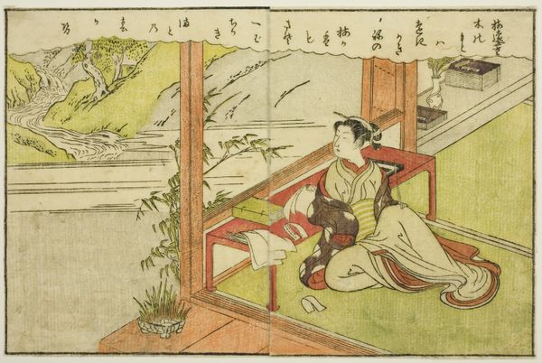 Editor: This woodblock print, a double-page illustration from Suzuki Harunobu's "Picture Book of Spring Brocades," dates back to 1771. I’m really drawn to the gentle, almost dreamlike quality of the scene, but I find it curious as a ‘landscape’ since the human element dominates. What stands out to you when you look at this piece? Curator: It's true, isn't it? Landscape often serves merely as a backdrop to human activity. To me, it whispers of enclosed spaces, of quiet observation and reflection, as if we’re glimpsing a stolen moment. The two women inside are in dialogue with something, someone out there that remains beyond our gaze. Notice the paper walls; those vertical strips create these parallel, superimposed screens... It creates a layered composition that draws your eyes toward that blossoming plum tree. Doesn’t that, in itself, feel symbolic, promising and eternal, as if a subtle hope pervades? What does spring signify to you in the piece? Editor: It really hits home that nature, represented by the blossoms, seems separate yet so vital. It definitely has a kind of hopeful feeling, this almost yearning in them as they reach toward spring! Curator: Indeed! Perhaps they see in those delicate blooms a reflection of their own aspirations, a silent dialogue between the human spirit and the promise of renewal. And look at their clothing, how meticulously rendered. What a perfect glimpse of fleeting beauty, made eternal through ink and wood. Editor: It's fascinating how much meaning can be packed into such a seemingly simple scene. I will keep a closer watch of those details when I look at artworks! Thanks for your insight. Curator: My pleasure! It's through these shared observations that art truly comes alive, isn't it? Always look beyond what you think is visible.
