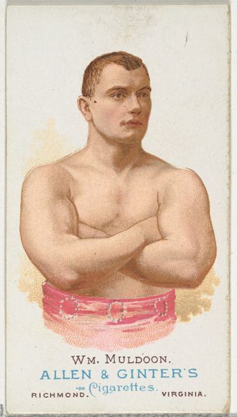 This late 19th-century chromolithograph, produced by Goodwin & Company, presents Emil Voss, celebrated as the "Strongest Man in the World," as part of a cigarette card series. Voss's muscular physique, rendered with meticulous detail, dominates the frame. The composition is tightly cropped, intensifying the focus on his form. The semiotic structure of the image operates through codes of masculinity and spectacle. Voss's crossed arms and direct gaze project confidence, while his flamboyant attire—a patterned top—adds to the theatricality. The vibrant colors, combined with the texture of the print, create a visual spectacle that speaks to the promotional function of the card. Ultimately, the visual rhetoric of this card hinges on the interplay between strength and performance, underscoring how identity is constructed through visual representation.