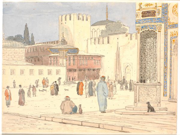 Curator: Oh, I adore this painting. There’s such a serene yet bustling quality to it. It's an oil painting by Cesare Biseo, titled "Motiv Aus Dem Orient." The light just shimmers! Editor: My first impression is a sort of faded glory. The palette is quite muted, which gives it a nostalgic feel, almost as if looking at a cherished old photograph, but I question its gaze: Who is this painted “Orient” for, and at whose expense? Curator: Right, the “Orient.” But look at the way the artist captures the architecture. That central dome has such a strong presence. I'm drawn into the scene as if I'm physically present there, breathing the very same air. Editor: It’s important to understand how European artists, like Biseo, represented North Africa and the Middle East. “Orientalism” as a genre was steeped in colonial power dynamics. What stories are omitted? Who profits from this visual language? Is it an empathetic approach to cultural representation? Curator: True, and that’s a conversation we should always have, absolutely. But I find beauty in the details: The textures of the walls, the individual faces, how he captures that hazy heat shimmering off the stone. It really sings! Perhaps the point is not whether the stories were omitted or if it served an old empire’s gaze—but to now center the conversations on whose lands the oil paintings depict in order to understand its value and role within its own culture. Editor: Yes, engaging with these images necessitates a critical awareness, especially in considering who is being visually consumed. We are actively analyzing historical power relationships and how that informs modern-day global perspectives and what role it can still hold for marginalized groups that it left behind or were made invisible at that time. It opens up questions, even today. Curator: Indeed! "Motiv Aus Dem Orient," what it says, what it obscures - layers and layers… A picture that stays with you. Editor: Exactly, by engaging critically, we make sure the narratives around these paintings are more complete, recognizing both beauty and complicity, allowing new art practices and perspectives to rise that center voices once shut out.