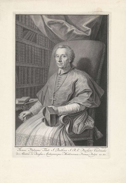 Curator: Oh, what a melancholic scene. It just drips with the lonely artist trope, doesn’t it? Editor: Indeed. We are looking at "Cellist by a Window," created in 1858 by August Allebé. The Rijksmuseum houses this graphite engraving, a beautiful example of romantic portraiture. Curator: Graphite, huh? The level of detail with simple graphite is astonishing. You’ve got the window panes, each painstakingly rendered, reflecting who knows what kind of grey world outside, all that careful hatching. And then the cellist himself – his longing gaze is just… palpable. It is quite something, no? Like a snapshot of yearning set down with lead. Editor: Precisely. Note the structural juxtaposition; the window acts as a rigid grid, framing the fluid lines of the musician and his instrument. The contrast invites a semiotic reading—confinement versus freedom, perhaps? Curator: Or maybe he's just waiting for the rain to stop! Jokes aside, I find his face quite telling, its so delicately rendered. You see the subtle gradations of tone, those delicate lines around his eyes—makes him seem utterly human and approachable, despite the era. A far cry from those stiff, powdered portraits of the elite. Editor: Good point, the romantic artists looked within. Notice the absence of vibrant colour redirects our attention to form, line, and composition, emphasising the subject's pensive mood. The engraver, probably following the artist, brilliantly captured textures: the glossy cello, the soft drape of his robe, all in monochrome. Curator: I agree; Allebé lets us glimpse the interior life of the musician rather than an ostentatious display of wealth. And for me, it’s about the music too; "Adagio con espressione," proclaims the bottom of the print, and it totally lands, even without hearing a note. Editor: This reading of “longing” resonates through these elements but can be amplified through period considerations too. Given the rise of nationalism in 19th-century Europe, artworks often sought to inspire emotionality to promote values of home and country through intimate scenes and the idealization of the sitter. Curator: Right? And with that in mind, a humble graphite engraving can hold the weight of the world. It's as much an archive of the past and snapshot of an emotion as it is simply about tones and shades and what you can capture with light on paper. Editor: So very well said, it prompts us to examine the dialogue between form and feeling, doesn't it? A simple print that sparks quite a bit, doesn’t it?