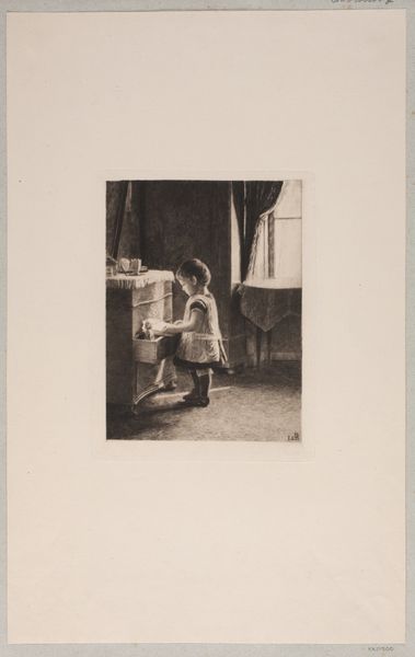 Curator: Here we have Gaston La Touche's "Plate from l'Assommoir (blacksmith)," created in 1878, currently residing here at the Art Institute of Chicago. The work is an etching, drawing and print rendered on paper. Editor: The somber mood of the image struck me first. It's almost monochromatic and depicts a solitary blacksmith, with soft hatching defining a roughhewn physique against what I think could be the glow from a forge. Curator: La Touche made this work during the rise of Realism, when artists like Daumier and Courbet were interested in depicting modern life as it was, devoid of sentimentality or idealization. Zola's novel, "l'Assommoir," captured this movement through the harsh realities of working-class life in Paris, and artists responded with powerful imagery to communicate it all. Editor: Exactly. And looking at the figure's coarse apron and hands, his gaze directed intently at the work before him. It seems to tell the story of hard manual labor; this isn’t romanticized craftsmanship but honest work. I see also how the visible lines from the etching add a tactile quality to the depiction, emphasizing the materiality of the artisan’s labor. Curator: Right, this print engages the debates circulating at the time around industrial labor and its place within French society. The Blacksmith serves as an icon, burdened but vital, at a time when artisanal jobs began fading amid industrial expansion. Editor: So you think La Touche is commenting on class divisions or perhaps making a claim to the importance of respecting craftsmanship during the machine age? The way that the Blacksmith almost fades in the smoke suggests the slow and sad decline of these trades. Curator: Indeed. La Touche seems to engage broader cultural dialogues by questioning progress' cost and considering the human aspects threatened by it, echoing Zola's critical reflections on similar themes within "l'Assommoir." Editor: Well, seeing how closely it relates to debates then happening within Parisian circles really offers an added lens to its understanding today! Curator: It's fascinating how art becomes intertwined with the period's intellectual history. Thank you for pointing out these aspects.