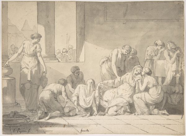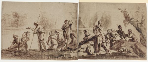 Cornelis de Wael created this print, "Men, Women, and Children on the Beach," in the 17th century, a period marked by significant social and economic shifts in Europe. In this intimate scene, we see men, women, and children gathered at the beach. The artist invites us to reflect on the roles and experiences of people in the 17th century through his representation of the characters. The women are depicted caring for children, while the men engage in conversation. This portrayal reflects traditional gender roles of the time, yet it also offers a glimpse into the everyday lives of families and communities. De Wael’s print doesn't simply show us people on a beach; it allows us to consider the historical context, personal stories, and emotional connections that shape our shared human experience. The scene presents an opportunity to reflect on our own identities, our relationships with others, and the ways in which art can serve as a mirror, reflecting both the past and the present.