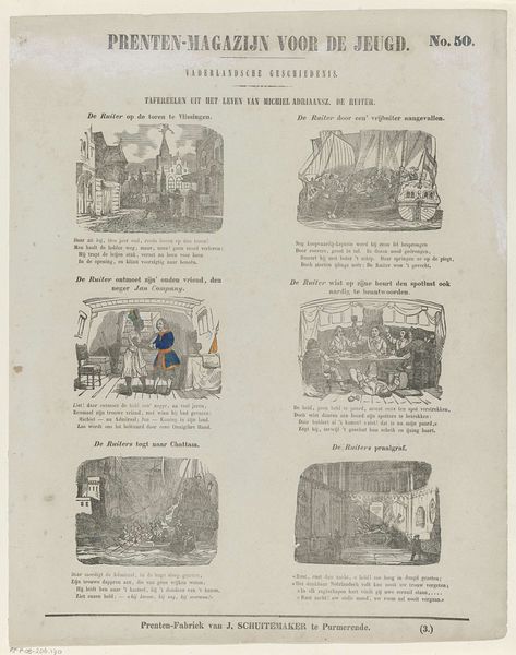 Curator: "Tamme Dieren," or "Domestic Animals," is an 1850 engraving by Jan Schuitemaker. It presents a page filled with vignettes of farm animals in a very particular, linear style. I’m initially struck by the rigidity of its composition; it seems less focused on artistry and more on the methodical display of information. What catches your eye? Editor: I notice the clear, almost scientific way each animal is presented within its individual frame. It reminds me of an encyclopedia or a study. How do you interpret this organized layout within the broader context of 19th-century Dutch art? Curator: Its format directs our reading. Notice how each scene is distinctly bordered. This compositional choice encourages a segmented reading experience. The uniformity emphasizes objectivity over expressiveness. How might these structural decisions relate to contemporary ideas regarding classification and scientific inquiry? Editor: Perhaps it’s meant to be educational, prioritizing clarity and order. But could that restrict the artwork’s potential for deeper emotional engagement? Curator: A valid observation. Restricting expressiveness might be its intention. Look closely at the lines forming each scene. What emotions do the techniques of engraving – hatchings and varied thickness – stir within you? Are they neutral? Editor: I can see a certain stillness within the engraving, a certain coldness, perhaps from the monochromatic palette. The use of line is descriptive, but not particularly evocative. Curator: Precisely. It compels the viewer to engage rationally, examining the specimens shown, rather than reacting emotionally. This is characteristic of its function and cultural milieu. Editor: I hadn't considered the emphasis on detached observation, but seeing how it shapes the structure really does change how I see the whole image. Curator: Indeed. Formal analysis allows us to perceive how even seemingly simple choices in composition, line, and structure contribute to a specific mode of perception.