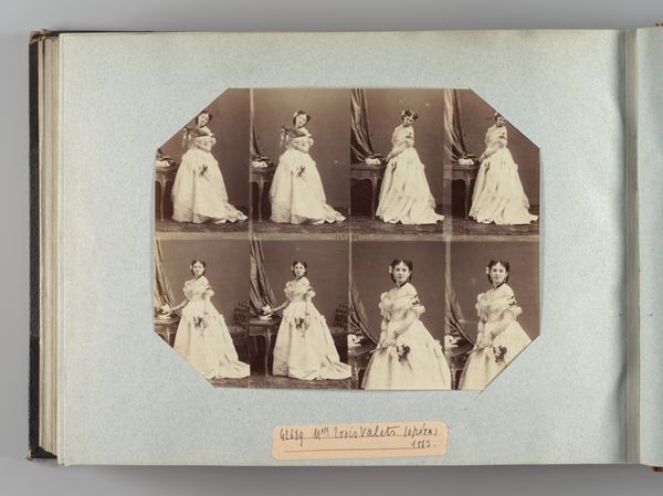 These eight photographic portraits of Constance Queniaux were made by André Disdéri, a master of the carte de visite. Observe how each image captures Queniaux in slightly varied poses and expressions. The arrangement of the images evokes the classical motif of the 'aura' – a halo of light or divine presence surrounding a figure, typically reserved for religious icons. Here, the repetition and slight variations in pose create a similar effect, suggesting an attempt to capture not just a likeness, but also the essence or spirit of the sitter. Consider how the gesture of her hands resting gently on a table echoes similar poses found in Renaissance portraits of nobility. It is a timeless symbol of poise and control, yet imbued with the specific social codes of the 19th century. The way we present ourselves, and the symbols we choose to embody, are part of a continuous, evolving dialogue between past and present.