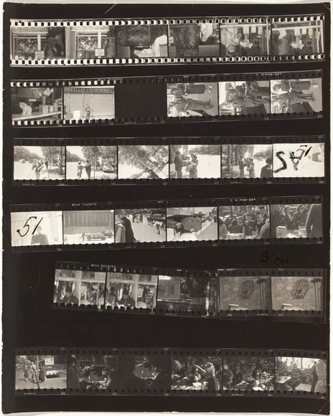 Robert Frank made this piece, *11th Street story E*, with gelatin silver print. He really embraces the photographic process here. It’s all about the physicality of the film strip itself. I think that's cool because, in my painting, I often leave traces of how things are made. The texture of the film, the sprocket holes along the edges, and the way it’s all arranged on the page. It becomes a visual poem. You can see these images of people, buildings, and street scenes. Each frame has a different level of clarity and focus, some almost ghostly. The white border around it flattens everything out. There's one frame, the second strip on the right-hand side, that feels particularly loaded. Someone posing in front of a window. Her arms are up, and the light is intense. There's something playful and performative about it, but also a little mysterious, like a scene from a movie. In some ways, it reminds me of Warhol and his explorations of film and celebrity, but much more intimate. The work is less about capturing a perfect image than about creating a conversation around seeing and experiencing.