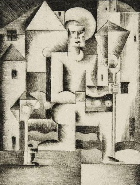 Benton Spruance created this lithograph, ‘Design for America No. 1’, using stone as his medium. The composition is a dynamic interplay of geometric forms in a full range of greys, evoking the monumental architecture of industrial America. Spruance masterfully uses line and shading to define complex shapes, creating a sense of depth and spatial ambiguity. The architectural forms seem to collide and merge, challenging our perception of structure and function. This disruption of expected forms could reflect the artist's commentary on the changing American landscape and perhaps, its socio-political structures. The visual tension is palpable. The semiotic system at play uses architectural elements as signs, pointing to broader cultural narratives about progress, industry, and societal design. By destabilizing these familiar forms, Spruance encourages a critical re-evaluation of their underlying meanings and values. Consider how the formal qualities of the lithograph, with its stark contrasts and fractured composition, reflect larger philosophical debates about modernity, representation, and the nature of American identity.