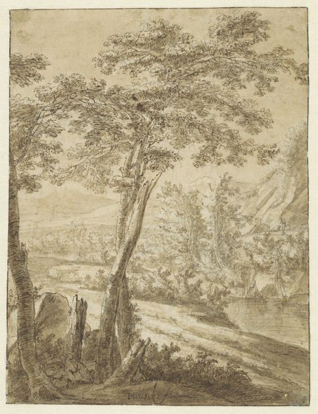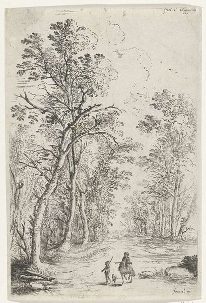 Curator: This delicate etching, called "Classical Landscape with a Building and a River," is attributed to Abraham Genoels II and thought to have been created sometime between 1660 and 1723. It resides here with us at The Met. Editor: My initial reaction is one of wistful calm. It's incredibly detailed, especially for an etching. The texture of the trees and the distant buildings are compelling, but there's a melancholy stillness to the scene, wouldn't you agree? Curator: Absolutely. Genoels, working within the Baroque tradition, was deeply interested in idealised landscapes. This wasn't just about representing reality; it was about crafting a vision of harmony, order, and a perhaps a romanticized view of the past. Editor: I see that, especially in how he positions the building, seemingly a fortress or castle, nestled into nature. There’s definitely an implied power structure at play. These classical landscapes, beautiful as they are, often functioned to naturalize existing social hierarchies. Land ownership and control are subtly, yet firmly, communicated here. Curator: Precisely. Etchings like this one were readily reproducible. Prints helped to circulate certain ideologies. Think about who had access to these images. Landed gentry could reaffirm their status through possessing, collecting and displaying images that confirmed their vision of a well-ordered society. Editor: So the image, with its rivers and carefully placed structures, isn't just decorative. It's an active participant in reinforcing a specific cultural and political framework. Even the picturesque qualities contribute – a cultivated nature mirroring a cultivated society, reinforcing particular perspectives on aesthetics, status, and belonging. Curator: Yes. And by controlling the narrative – presenting this cultivated landscape as the ideal – the elite of the time reinforced their position and their values. It speaks volumes about who gets to define beauty, and whose interests that definition serves. Editor: Makes you wonder what stories are left untold in these idealized scenes, doesn't it? Curator: Always. This image encourages us to look at what is represented, but also to consider whose perspectives are missing from the picture. Editor: A valuable perspective, indeed, and vital for interpreting imagery from the past.