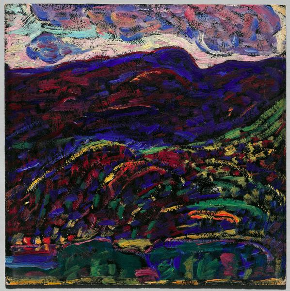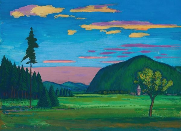 Alexej von Jawlensky made this painting, Summer Evening in Murnau, using broad strokes of intense color. He’s not just painting what he sees, but how he *feels* about what he sees, right? Check out how the mountains, rendered in deep blues, almost vibrate against that bright, orangey-yellow sky. The paint isn’t overly thick, but you can still see the marks, the energy of his brush. It’s like he’s wrestling with the landscape, trying to capture its essence with these bold gestures. There's something almost Fauvist about it. My eye keeps going to the line of dark blue that runs across the bottom third, separating the land from the water. It’s such a simple, almost childlike stroke, but it anchors the whole composition. It reminds me a bit of Matisse, with that same willingness to simplify and exaggerate. Ultimately, Jawlensky is not trying to give us the definitive version of this landscape. Instead, he invites us to experience a moment, a feeling, a way of seeing.