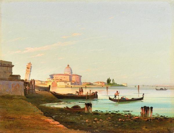 Curator: It feels like a sigh. A gray, dreamy sort of sigh from a city awakening. Editor: We are looking at Lev Lagorio’s oil on canvas from 1859, titled "View of the Neva and Peter and Paul Fortress.” A sprawling cityscape bisected by the Neva River. Notice how Lagorio balances industry and nature. Curator: Yes, there’s the Fortress, almost shimmering in the distance, juxtaposed with these grounded, almost gritty, docks in the foreground. You can almost smell the river, you know? It makes me think about the labor that sustained that grandeur in the distance, those fine buildings. All this busy labor right here. Editor: Absolutely, and the artist's treatment of materials reflects that. The loose brushstrokes that create the illusion of choppy water. How many figures can you see laboring near the docks? They are moving something on those heavy looking crafts. The romanticized skyline juxtaposes against the daily toil. I also wonder about the relationship between production of this kind and how it influences painting as a method itself. Curator: Makes you think, what were they carrying? Probably things the fancy folk up river needed, right? It all feels a little melancholy, yet so full of life. Editor: Precisely. The watercraft become integral parts of the city's fabric. These aren’t decorative. The very surface of the water indicates labor and traffic as material realities. The movement in the painting also draws me into imagining its function for distributing commodities. It also is interesting how it challenges high art with this focus on ordinary lives and industry, reflecting a subtle tension. Curator: In a way, the whole painting, like the Neva, becomes a conduit. Linking the mundane and the magnificent. It really hums, doesn't it? Even after all this time. Editor: Indeed. And by recognizing those connections, that painting hums that labor on, making us listen closer to these whispers of history embedded in these materials.