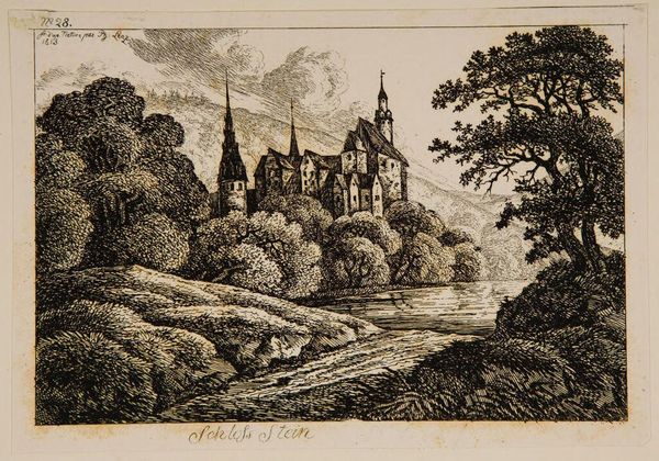 Curator: Here we have Johann Philipp Wilhelm Lenz’s “Schloss Stein.” The landscape is realized with an etching technique. Editor: There’s a starkness to it; the lines, meticulously crafted, give the scene a slightly ominous feel. Is it the subject, or the medium? Curator: Etching, as a process, involves considerable labor. The acid’s bite on the metal plate leaves a specific material trace. The artist is mediating nature through a highly industrialized process. Editor: The composition is dynamic, though. The tower, trees, and the architecture itself create a sense of depth, even with the limited tonal range. Curator: Right. It raises questions about the relationship between industrial reproduction and the depiction of nature, and ultimately, about access to land and the means of its representation. Editor: Seeing how the line work builds tone and texture is interesting. It reveals how meaning can emerge from such formal constraint. Curator: It does, doesn’t it? Thanks for pointing that out, I was only seeing the labor involved. Editor: Likewise, I appreciate how you made me consider what this might say about how we interact with land and history.