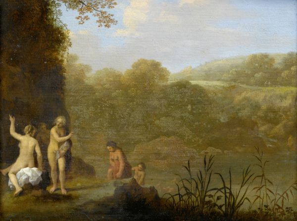 Curator: Nicolas Poussin's "Nymphs and a Satyr," crafted circa 1625 to 1627, offers a lush scene rendered in oil paint. What’s your immediate take? Editor: The composition strikes me immediately. The figures are arranged almost as in a frieze, and the darkness of the trees really pushes them forward into the light. Curator: Poussin employs mythology here to explore human nature. The satyr, a symbol of untamed desire, enters the idyllic space of the nymphs, challenging their composure. Note, too, the implicit voyeurism: We are invited to partake in this clandestine moment. Editor: I agree; that careful balance feels precarious, amplified by the composition's structure. Notice how Poussin uses opposing diagonals, grounding the figures but creating a tension, especially with those darker tones versus the lighter ones? The tension creates so much dynamic unease. Curator: Absolutely, and the woodland setting is more than just a backdrop. For Poussin, landscape often mirrors the internal states of his figures, contributing to a deeper narrative. The trees could even symbolize constraints and limits, a counter to the free flow of libidinal energy. Editor: And within that constraint, you get the soft treatment of light across the figures, which has to also mean something to understanding how he creates atmosphere. Curator: True; and it shows you his technical expertise and how much of the academic art approach he valued. Editor: It's interesting how the painting uses visual pleasure to mask a potentially disquieting allegory of desire and its consequences. Poussin asks us to confront the uncomfortable truths beneath the beautiful surface. Curator: Indeed. Poussin’s work urges us to look beyond the immediate sensory appeal. Editor: Absolutely; I initially reacted to its overall structural tension, but seeing its engagement with underlying themes of desire is really insightful.