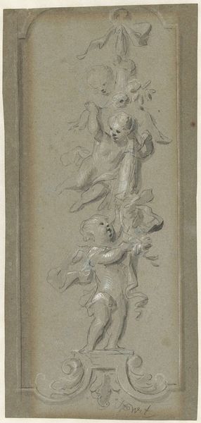 Curator: Here we have a work entitled "Ontwerp voor een wandbespanning met twee putti," or "Design for a wall hanging with two putti," by Jacob de Wit, dating from the 18th century. It’s rendered with pencil and watercolours on paper. Editor: Oh, this is charming! The muted palette gives it an almost dreamlike quality. And the chubby cherubs clinging to what looks like a decorative column - are they up to no good, or are they simply enjoying the view? Curator: Well, these putti, or cherubs, are quite typical of Baroque art. They're often used to convey allegorical messages. This drawing likely served as a preliminary design for a larger wall decoration, possibly a tapestry or painted panel. Editor: An initial drawing for some serious opulence! Look how delicately rendered their forms are. There's an implied softness to those cherubic figures, that even I, a modern art fiend, finds captivating. It's funny to think this carefree sketch was a step towards grand ornamentation. Curator: The placement of such designs in grand homes served a purpose. These weren’t merely decorative, they would be tools used to elevate the stature of their commissioners, reminding visitors of their wealth and sophisticated taste. De Wit himself was highly sought after for such decorative schemes. Editor: So, like a really ornate mood board intended for aristocrats? But even knowing all that, I still circle back to those mischievous-looking cherubs. Their poses and expressions... there’s this sense of playfulness despite the formality of it all. Do you think De Wit added a little of his own spirit into this work, his own breath of life, as it were? Curator: It's a compelling thought! While commissioned artwork often adheres to certain established conventions, there's always room for an artist's personal touch. De Wit would have been aiming to delight his patron but also showcase his skill as an artist. Editor: Well, whether a symbol of wealth, sophistication, or simply playful artistry, it has clearly held up! It leaves me considering the layers of intent and expression folded into what could easily be written off as a simple decorative drawing. Curator: Indeed, a single artwork holds such complex meanings when we understand the period of creation and artist's intent.