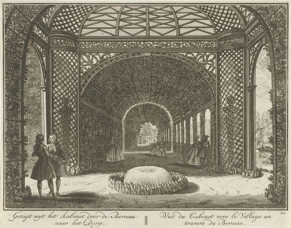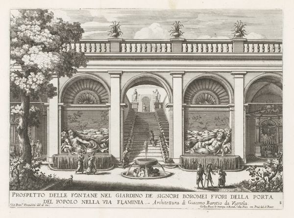 Editor: This is "Gezicht door een poort op de orangerie op landgoed Clingendael," a print by Daniël Stopendaal, likely made sometime between 1682 and 1746. It’s held at the Rijksmuseum. What strikes me most is the intense detail achieved through engraving. How do you read this work? Curator: It’s fascinating to consider the labor involved in producing this image, isn’t it? Stopendaal "geëtst en gegeëtst," meaning drawn and etched, which speaks to a meticulous process. The commercial aspect is also apparent – note "door N. Visser uytgegeven met Privilege", someone had the right to commercially produce this work, very carefully managing intellectual and material property for profit. Editor: So, beyond the aesthetic qualities, you see the printmaking as an industry in itself? Curator: Precisely. The very existence of this print, replicated and distributed, reflects a shift in how landscapes are consumed. We see it reproduced but forget that landscape becomes a commodity, marketed to reflect an idealized lifestyle linked to land ownership, architecture and leisured status of the elite. Consider the formal garden – itself a product of extensive, controlled labor. Editor: It makes you wonder about the social implications of such pristine, controlled environments… the labor that created them must have been invisible to the people enjoying the "plaifantiehuis." Curator: Exactly. The idealized scene masks the material realities of its creation and the privilege inherent in such leisure. The controlled nature of it all highlights that labor. Editor: This perspective is really eye-opening. It goes beyond simply appreciating the art and delves into its role as a manufactured image, both in its physical production and the lifestyle it represents. Thanks. Curator: My pleasure. Understanding art as a product of labor and material conditions gives us a richer, more critical understanding of its historical significance.