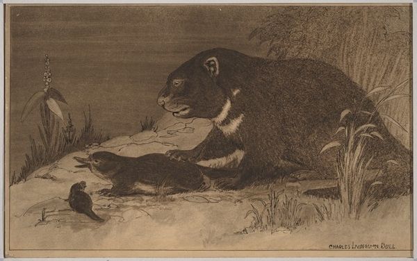 Editor: This oil painting, entitled "Grizzly Bear and Mouse" by George Catlin, is striking! The sheer difference in scale is fascinating. How would you approach interpreting it? Curator: Note the artist's command of chiaroscuro. See how light and shadow sculpt the bear’s form, lending it a palpable weight and texture. And consider the composition: the massive, looming bear dominates the frame, dwarfing the tiny mouse, almost a footnote in the lower right. Editor: Yes, I noticed the dramatic contrast! The mouse is so small; is it meant to symbolize something specific in contrast to the bear’s imposing presence? Curator: Perhaps. But let’s consider what’s rendered here. Notice the fine rendering of the bear's claws, each a precise stroke contributing to the overall impression of power, vis-a-vis the relative lack of detail given to the environment in general, save for where its paws touch the ground. Observe the limited color palette. Brown, beige and blacks, all arranged with purpose and meaning. The palette reinforces the themes of dominance and vulnerability so obviously in play here. Editor: That makes sense. So, you’re saying that it is through visual elements that the painting communicates the most. Curator: Precisely. Catlin directs the gaze through contrasts in scale and the dramatic deployment of light. What do you make of that tiny bit of blue sky in the composition? Editor: It seems out of place given how dark the colors are in the rest of the painting! Now, reflecting on how the visual tension carries the central theme is incredibly helpful. Curator: Indeed. And I appreciate your keen eye in noting that sky! We have much to learn from what appears simple.