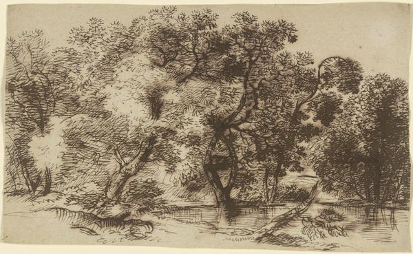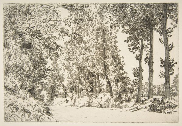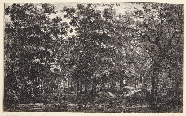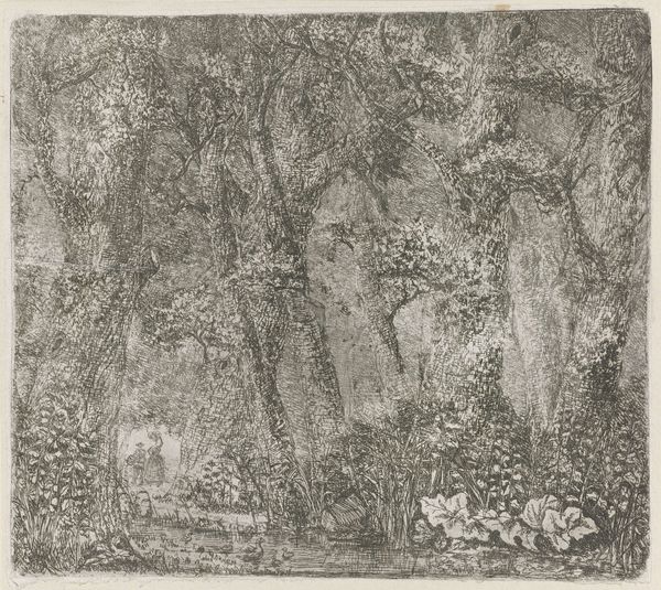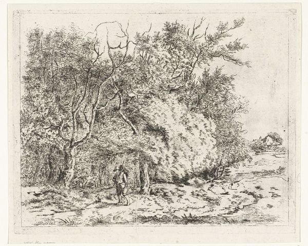 Eberhard Cornelis Rahms created this landscape, called Bosgezicht, using etching in the nineteenth century. Typical of the period, it reflects a Romantic sensibility with its focus on nature and the sublime. During the nineteenth century, there was a growing appreciation for the natural world, with artists and writers celebrating its beauty and power. But it wasn't just a sentimental interest; thinkers were also concerned with humanity’s place within a rapidly industrialising world. The Dutch landscape tradition had deep roots. The artwork draws on established conventions, such as the framing of the view by trees and the inclusion of figures to provide scale and a human element. But there is also a distinct atmosphere which evokes the mood and feeling of a place. Understanding this artwork involves looking at the period in which it was made, as well as the broader social and cultural contexts that shaped its creation and reception. By examining these factors, we can gain a deeper understanding of the artwork and its significance.