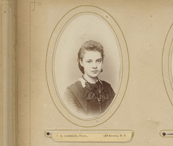 Curator: The gaze in this photograph is so direct, almost unsettling. It is identified as "Portret van een vrouw met oorbellen," which translates to "Portrait of a Woman with Earrings," created sometime between 1861 and 1874, part of the Rijksmuseum collection, and attributed to Albert Greiner. Editor: There's a severity there, definitely. The sepia tones, the tight framing, they amplify the weight of the moment, don't they? It makes me wonder about the process. The subject sitting still, maybe for hours, in a studio, under those harsh lights of early photography. The laborious darkroom processes required afterward must have also imparted some solemnity. Curator: Absolutely. Note the delicate framing of her face within the oval vignette. It draws the eye directly to her expression, bypassing much of the background context, enhancing a pure, distilled presence. It's a study of her face first, rather than a larger picture of identity. Editor: Yes, and what do those earrings mean? They are an object and tell of material wealth but also mark social ritual and bodily practices of beautification and display in that era, a complex mix of social expectation and possible self-expression. Perhaps photographic portraits became new commodities through the late 19th century, much as status symbols were adopted through the early twentieth century. Curator: That material aspect truly resonates. This portrait as object is part of an early mass phenomenon, a form of capturing a personal history and circulating this information throughout personal networks. As the technology shifted, portraiture transitioned from painting and sculpture toward the reproducibility and accessibility that would quickly be afforded by photography. The semiotics of photography and its symbolic gestures democratized art, too. Editor: Considering this portrait as a social product certainly offers depth. Thinking of it this way gives the whole picture a very new light. Curator: Indeed, by emphasizing form and production we reveal ever new lenses through which we may experience artworks like Greiner’s. Editor: The nuances, so complex.