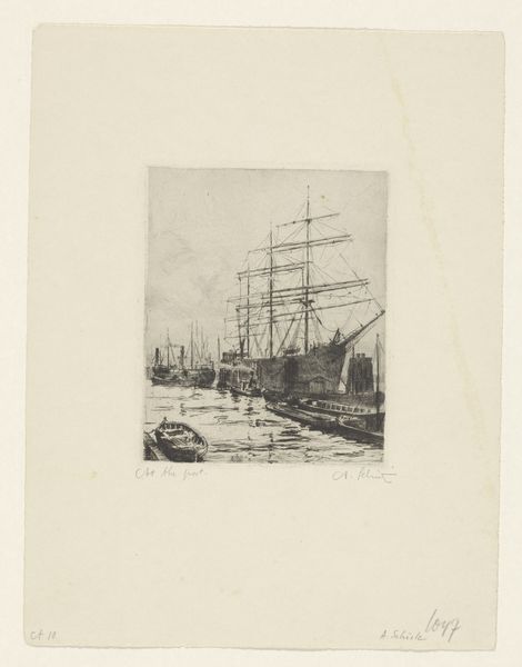 Philip Zilcken created this etching titled 'Oostelijk dok, te Amsterdam' using etching in the late 19th, early 20th century. Zilcken was a Dutch artist, who lived through a time of significant transformation in Europe's social, political, and economic structures. Here we see the port of Amsterdam, filled with ships that were essential to the burgeoning trade networks of the time. A romantic portrayal of industry and commerce, it invites us to consider the labor, exploitation, and environmental impact linked to maritime trade. As an artist, Zilcken stood at an interesting intersection of privilege and observation, documenting a world that relied on complex systems of labor. The etching serves as a lens through which we can reflect on the relationship between progress, power, and the human cost often hidden beneath the surface of such scenes.