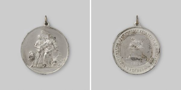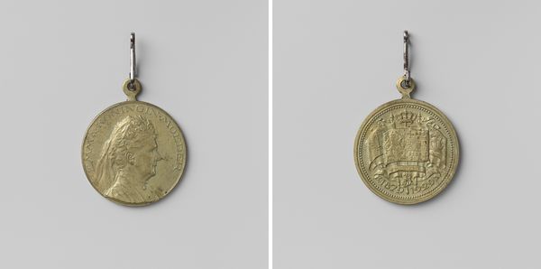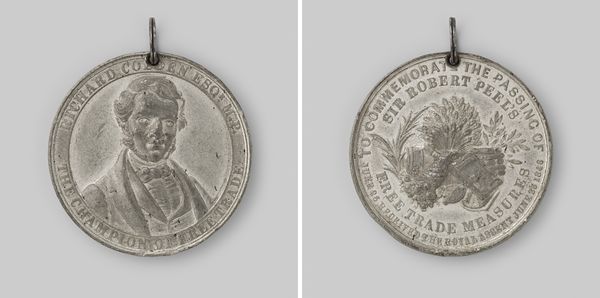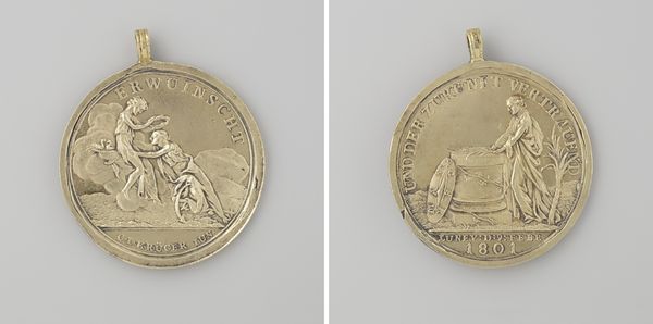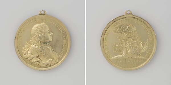 Curator: This exquisite metal relief is titled "Vrede te Aken," commemorating the Treaty of Aix-la-Chapelle in 1748. The artist is Martin Holtzhey. Editor: The piece has a silvery luminescence, reflecting the material's polish and the way the light delicately plays across its surface. The scale also seems quite intimate, perhaps a personal keepsake. Curator: Indeed. Formally, we can observe how Holtzhey employs allegorical figures, framing them with text to underscore the symbolic weight of this treaty. Consider how the portraiture and inscription fuse to convey both individual and political importance. Editor: Focusing on process, I find myself thinking about the labor involved in crafting such detail in metal—the careful chiseling, polishing. This wasn't some mass-produced item, but rather a work showcasing meticulous craftsmanship, commissioned no doubt for a specific purpose and patron. It begs questions about who held and circulated it. Curator: Note the clear division in the piece itself. On one side we have the powerful, refined portrait, almost neoclassical, and on the other the chaos of putti, objects and figures all piled on each other in a more baroque display. Editor: To your point on neoclassicism—consider the societal forces at play. The medal symbolizes the resolution of conflict. Its materials, predominantly silver, are circulated because of war reparations—funding further labor, material production, and acts as a potent reminder of conflict's cyclical nature within society. Curator: Fascinating! It really puts the seemingly clean, finished aesthetic of the piece in a more conflicted light. What starts as an observation in aesthetics then translates directly into how society understands the treaty. Editor: Yes, looking at its material properties we find so many rich ties with both societal hopes for a new beginning as well as tangible reminders of the war that led to its existence. Curator: A remarkable synthesis, wouldn't you agree? Analyzing "Vrede te Aken" through this lens illuminates both artistic intention and sociopolitical dynamics. Editor: Exactly! Bringing together discussions around materiality and formal construction, we find new context to understanding art in public life.