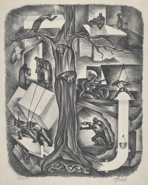 This is Jolán Gross-Bettelheim’s “Fascism II,” a drawing. It’s full of hatching, cross-hatching, little lines building up to form dark shadows, and leaving other areas untouched as highlights. Gross-Bettelheim’s mark-making feels urgent, like she’s trying to capture something fleeting. The texture created by these lines gives the drawing depth. Looking at the center of the work, at what appears to be a rib cage, it feels mechanical. The lines give the image a rigid, almost architectural quality. The contrast between light and shadow is stark, creating a dramatic effect. It’s as if the artist is using light to expose the darkness she sees in the subject. This reminds me of Otto Dix, another artist grappling with the horrors of war and political extremism. Both artists use unflinching imagery to confront viewers with uncomfortable truths. Ultimately, art like this serves as a reminder that we need to stay vigilant and question the world around us.