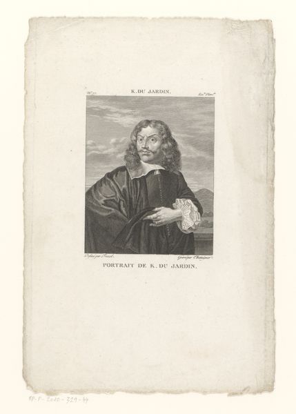 This is a reproduction of a portrait of Jan Cossiers by Joseph Maes, created using engraving techniques. Notice the symbolic gesture—Cossiers' hand placed over his chest. This motif carries rich historical weight. The hand-over-heart gesture, seen across eras, signifies sincerity, loyalty, and heartfelt emotion. Think of ancient orators, medieval oaths of fealty, or even modern-day pledges. It is a visual declaration of one's inner truth. Consider how this gesture appears in religious contexts too, where it symbolizes devotion and piety. It's fascinating how the same gesture can recur in secular and sacred settings, each time imbued with new layers of meaning while retaining its primal essence. Such recurring motifs are not mere coincidences but rather manifestations of shared human experiences, echoing through our collective memory. These symbols resonate because they tap into deep, subconscious levels of understanding. The hand-over-heart is more than a pose; it's a timeless expression of vulnerability and truth.