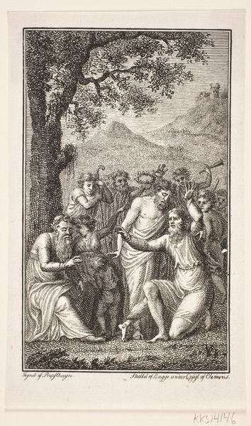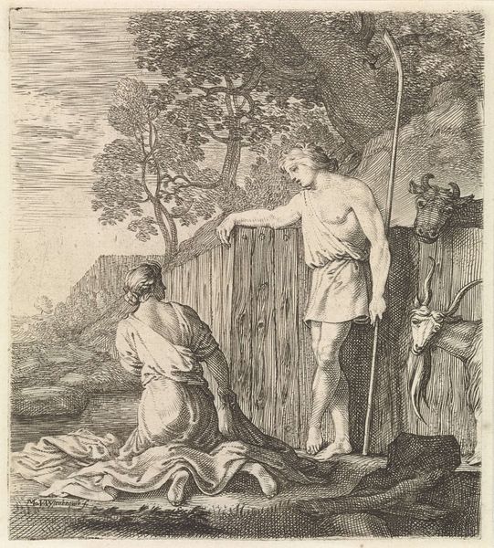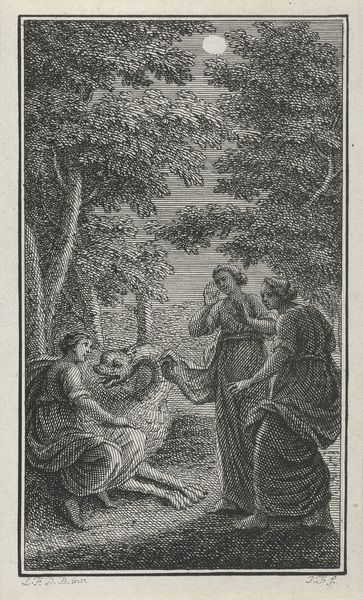 Reinier Vinkeles created this print, Jerobeam en de profeet Achia, in 1784. The composition, rendered in stark monochrome, immediately draws us to the foreground. Two figures, draped in fabric, occupy a space framed by the organic lines of a tree on the left and an open landscape on the right. Vinkeles uses line and texture to create depth, contrasting the intricate details of the foliage with the smoother planes of the figures' robes. The tearing of cloth is central to the narrative. Here, the act of tearing fabric becomes a potent symbol, destabilizing the established order. This is reinforced by the visual structure, the way the composition divides and mirrors itself, suggesting a kingdom on the brink. Vinkeles is not merely illustrating a biblical story, but engaging with broader questions of power, destiny, and the inherent fragility of human constructs. This work thus functions as more than a simple illustration; it’s a meditation on the transient nature of power.